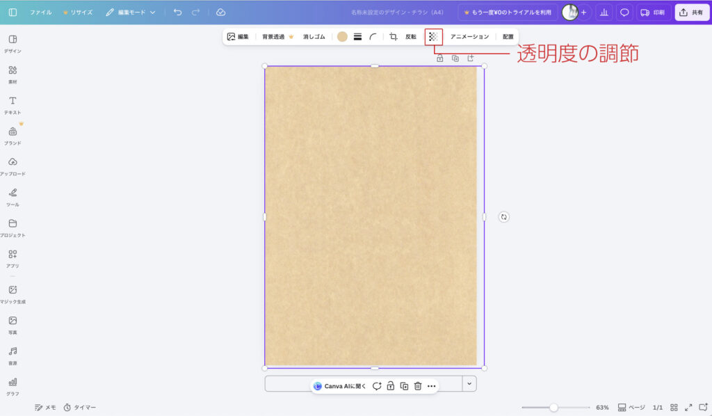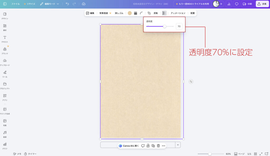 おしゃれなテンプレートが豊富なCanvaでは、スキャンした素材の透明度を調整するのがポイントです。