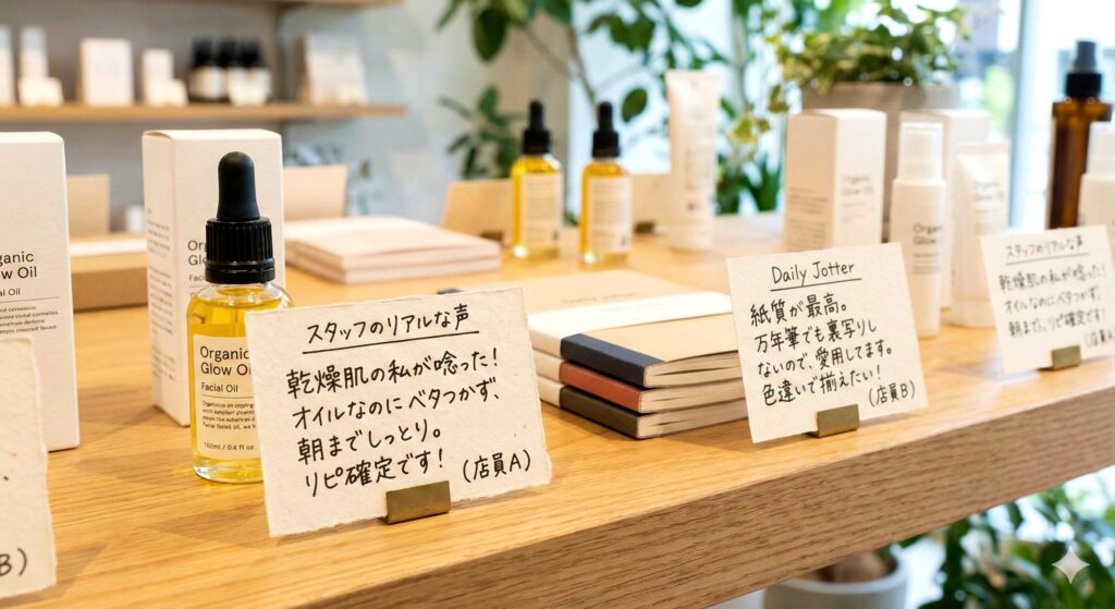 「スタッフのリアルな声」を手書きで添えることで、広告コピーではない「本音のレビュー」としての信頼感が生まれます。
