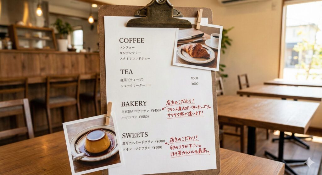 整った文字の横に、おすすめ商品だけ「店主のこだわり!」と手書きで添えてあると、つい注文したくなりませんか?