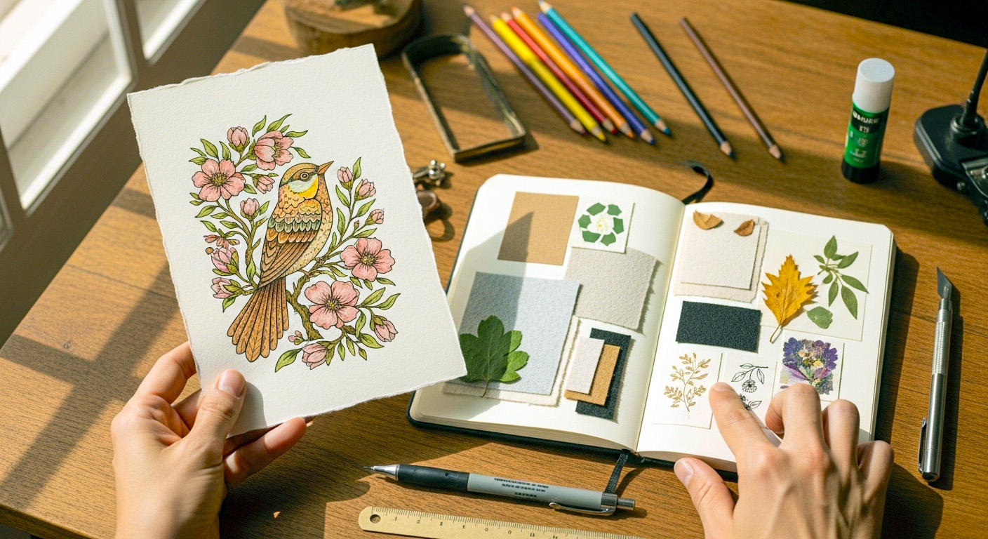 画用紙や少し凹凸のある紙がおすすめです。コピー用紙よりも繊維感が出やすく、デザインに自然な味わいが加わります。