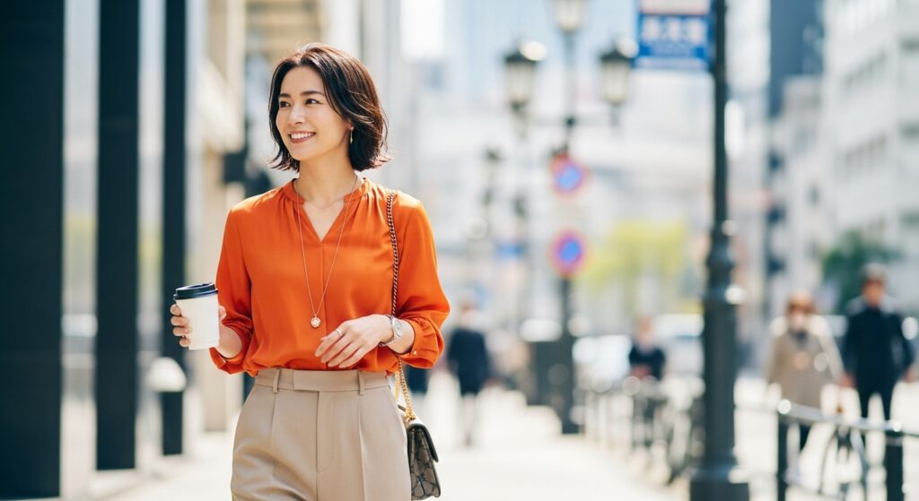 鮮やかなオレンジのVネックブラウスと、明るいベージュのセンタープレスパンツ。ネックレスや腕時計はゴールドで統一。 - 成功体験