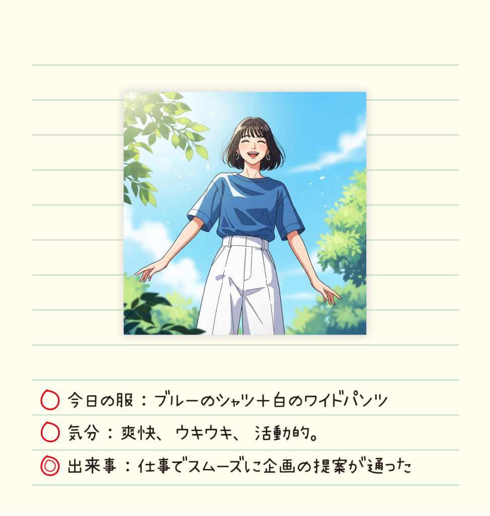 服選びが楽しくなり、自信を引き出す習慣にするためにはフィードバックが欠かせません。そこで、ぜひおすすめしたいのが「ファッションダイアリー」です。