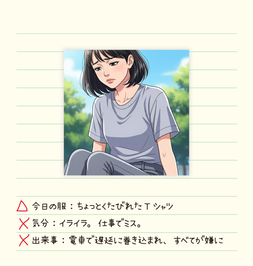 ファッションダイアリーは、「今日何を着たか」を記録するだけでなく、服と感情の相関関係を分析する自己発見のツールです。