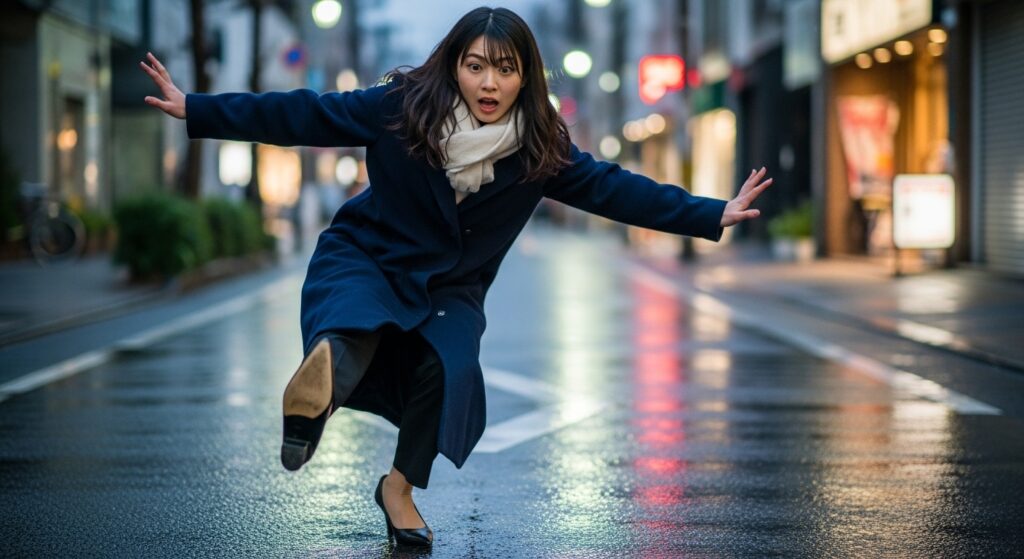 濡れた路面では、滑りやすい靴は非常に危険です。