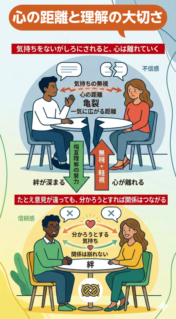 たとえ意見が違っても、相手が分かろうとしてくれていると感じられれば、関係は簡単には崩れません。逆に、自分の気持ちをないがしろにされたり、軽く扱われたと感じた瞬間、心の距離は一気に広がっていくのです